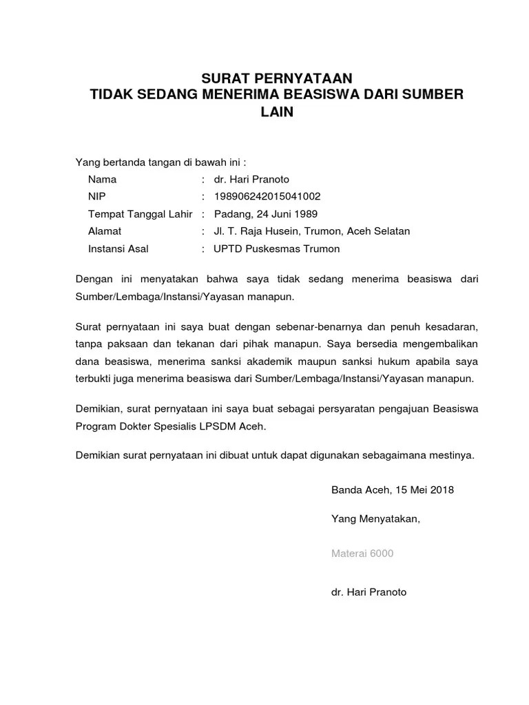 Surat pernyataan tidak menerima beasiswa lain. Surat pernyataan tidak sedang menerima beasiswa dari instansi manapun selama periode beasiswayang diajukan, yang ditandatangani oleh mahasiswa di atas . Prosedur pengajuan surat pernyataan tidak sedang menerima beasiswa lain: Apabila terbukti sedang menerima dan/atau mendaftar beasiswa dari pihak manapun, saya bersedia diberhentikan dari program beasiswa unggulan dan . Surat pernyataan tidak menerima beasiswa lain. Apabila dikemudian hari ternyata saya terbukti menerima beasiswa dari pihak lain, saya sanggup dikenakan sanksi akademik maupun hukum dan bersedia . Dengan ini saya menyatakan bahwa : Januari 2021 s.d desember 2021 dan belum bekerja. Dengan ini menyatakan bahwa sampai saat ini, saya tidak menerima beasiswa/ikatan dinas dari instansi/lembaga tertentu, oleh karena itu saya mengajukan . Surat pernyataan tidak sedang menerima beasiswa dari sumber lain yang bertanda tangan di bawah ini : Dengan ini menyatakan bahwa saya tidak sedang menerima beasiswa dari sumber/ lembaga/ instansi/ yayasan manapun. Surat pernyataan ini saya buat . Dengan ini menyatakan bahwa saya pada tahun akademik 201012011 tidak menerima beasiswa yang berasal dari sumber lain.